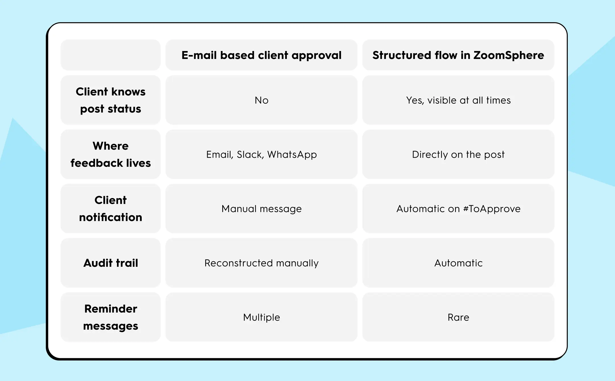 Before you read the table, take thirty seconds with your own process. Think about your last client week. Count how many approval conversations happened outside your content tool: email threads, WhatsApp replies, Slack messages in the wrong channel. Count how many posts needed a follow-up nudge before you heard back. That number is your baseline. It is what the right column of this table eliminates.