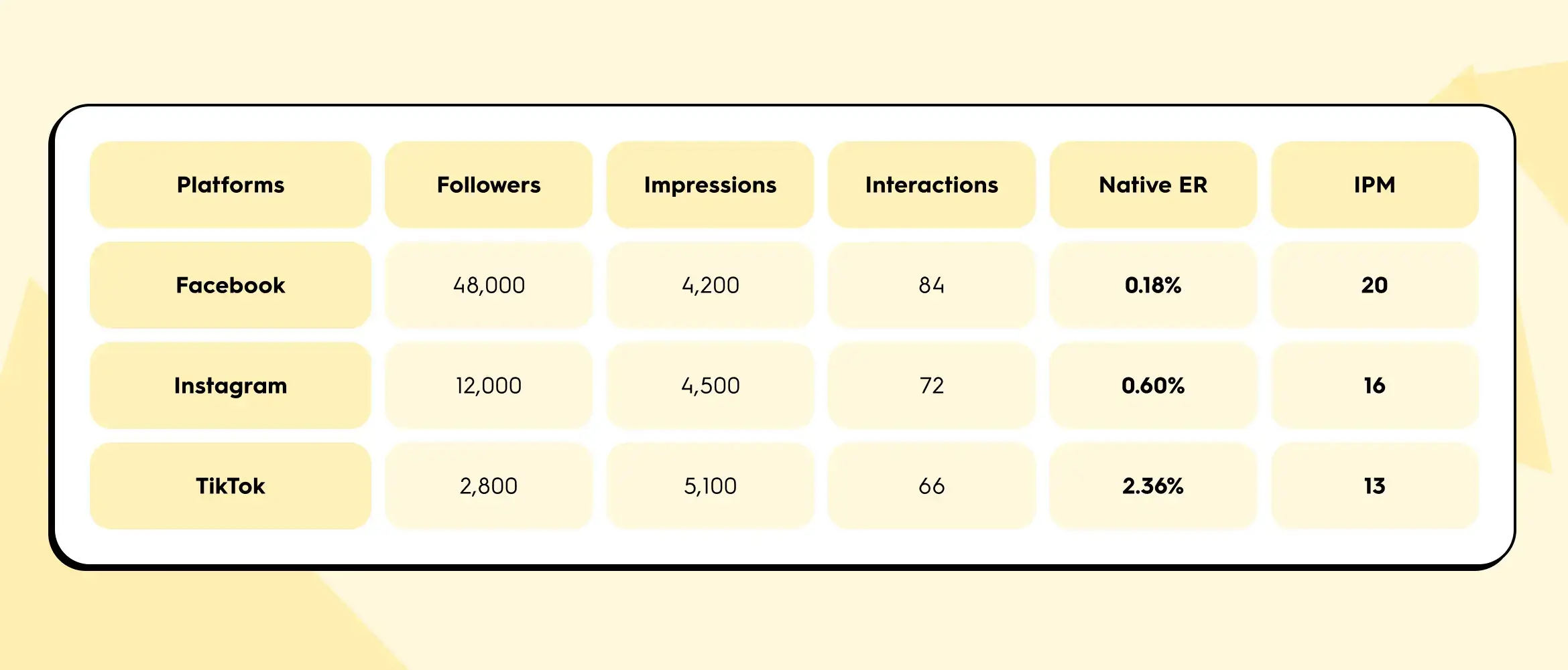 Native engagement rate ranks TikTok first by a mile (2.36% crushes 0.18%). But IPM ranks Facebook first. The disagreement isn't a calculation error. Native ER is inflated on TikTok because the follower denominator is small. Per 1,000 actual eyeballs on the content, Facebook drove the most interactions.