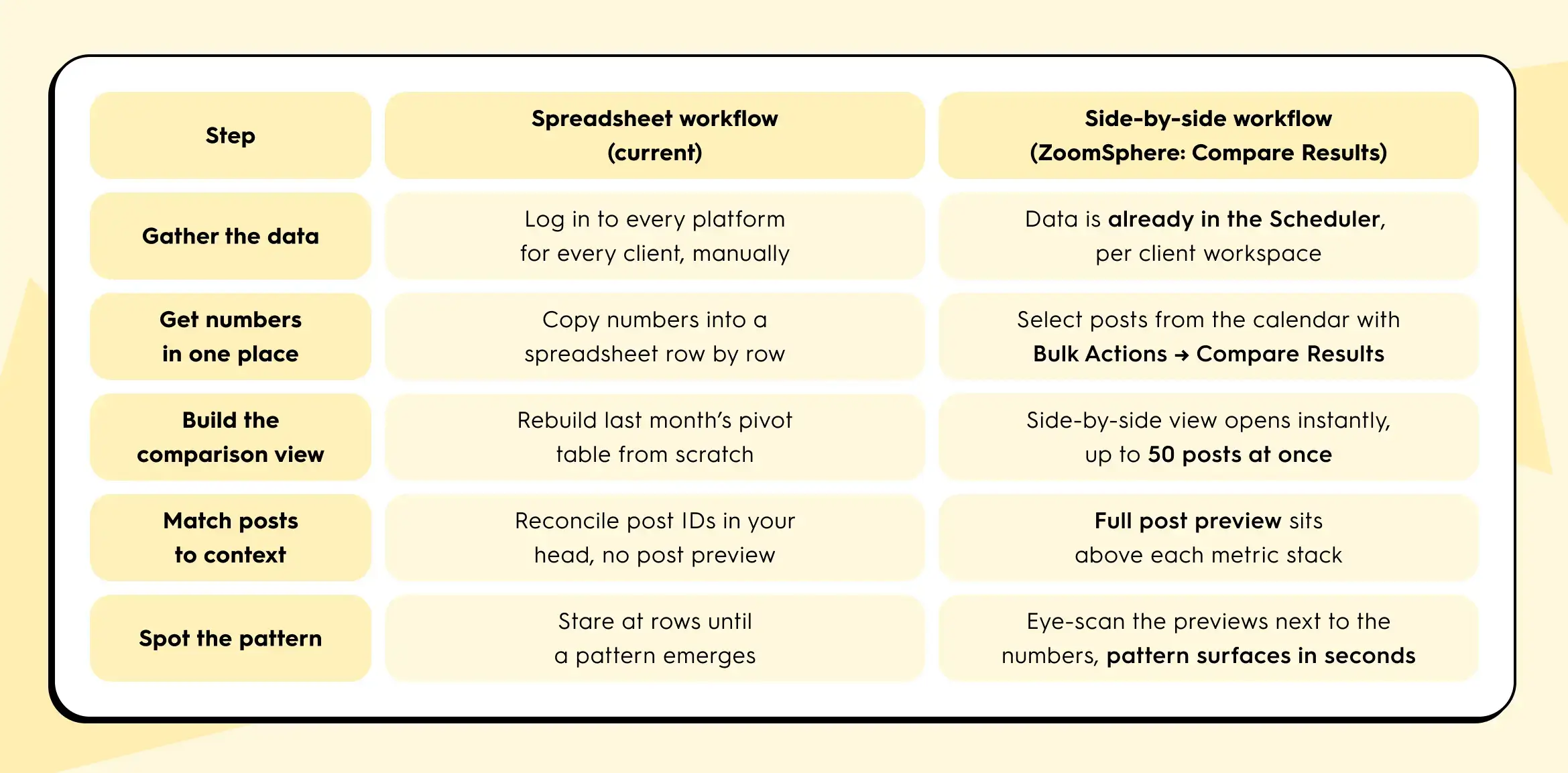 Agencies running 5 to 15 clients feel this harder than anyone, because the comparison work multiplies with every account. This article walks through three comparison patterns that turn 20 published posts into decisions your next client call can actually use, and shows why a side-by-side view (like ZoomSphere's Compare Results inside Bulk Actions) replaces the end-of-month spreadsheet rebuild that most agency teams quietly dread.
